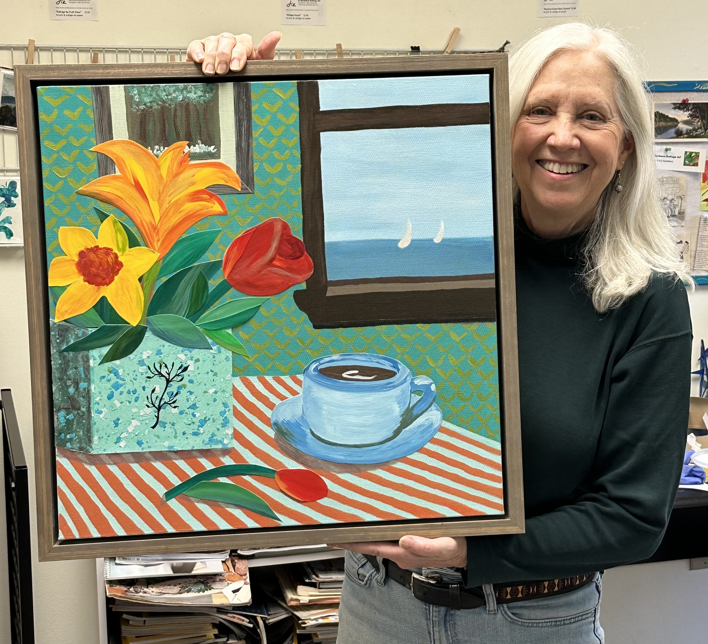 You could own this professionally-framed mixed-media work, “Still Life with Coffee in Maine” for only $285. Please contact me if you’re interested!